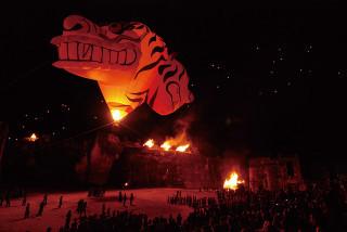 2009年にバリ島で開催したイベント。「電力をできる限り使用しない」ことをねらいに、巨大な松明と生火で演出。熱気球はスペインにて制作。