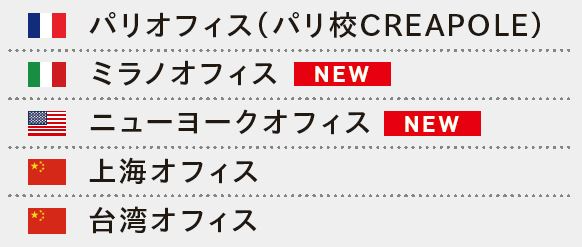 モード学園には姉妹校のパリ校(CREAPOLE)をはじめ、海外オフィスを設置しています。今回、ミラノとニューヨークにもオフィスが誕生し、世界に5つのオフィスが設置されました。 各オフィスでは海外研修・実習や留学時のサポートから、海外企業や教育機関との連携、また海外から直接入学する際の入学相談まで、グローバルな学びを支援しています。